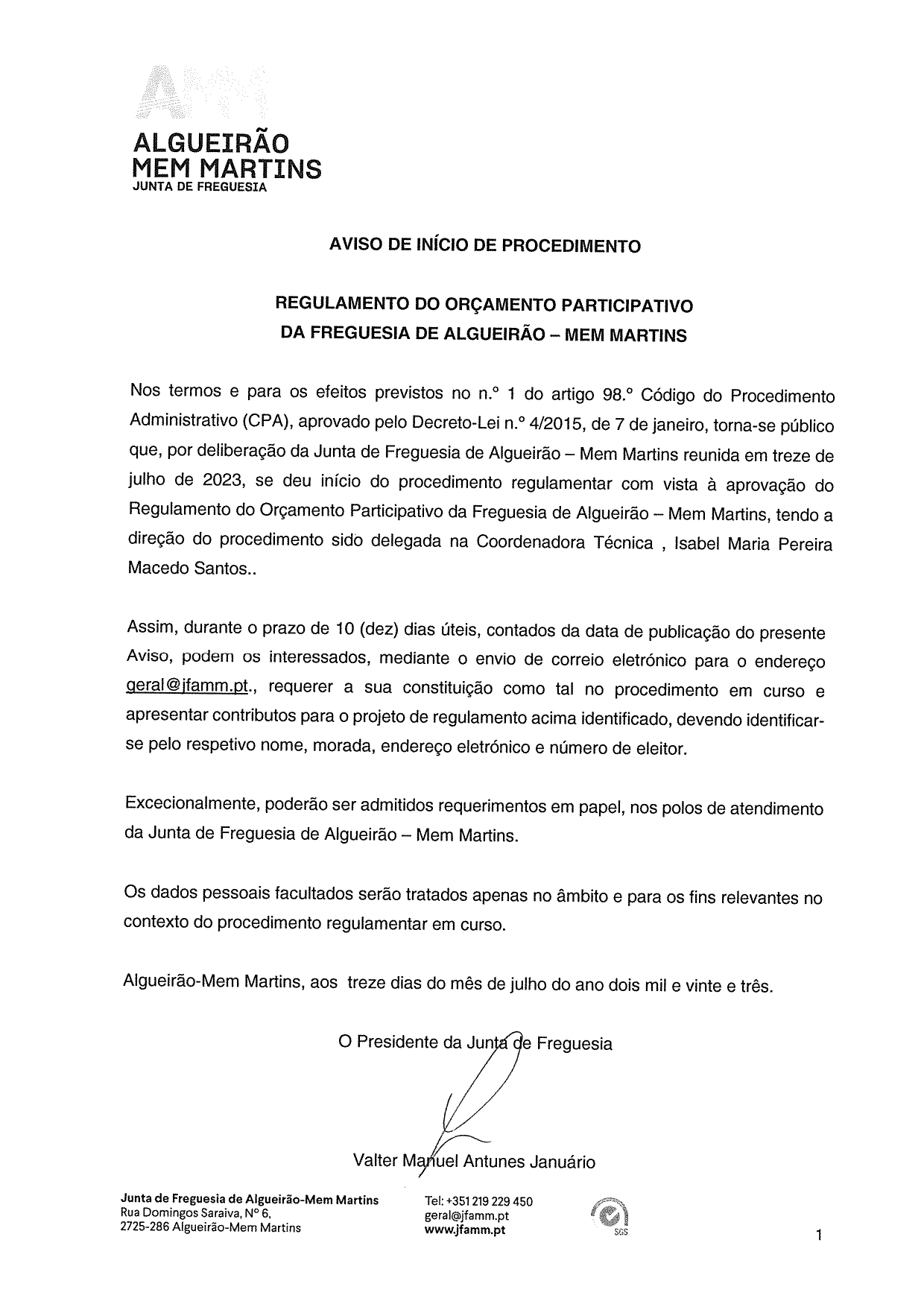 Informamos que ao dia de hoje, 13 de julho de 2023, se deu início ao procedimento regulamentar com vista à aprovação do Regulamento do Orçamento Participativo da Freguesia de Algueirão-Mem Martins.