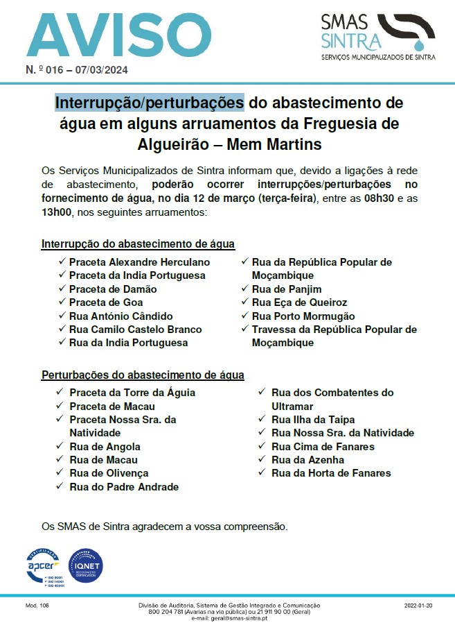 Os Serviços Municipalizados de Sintra informam que, devido a ligações à rede de abastecimento, poderão ocorrer interrupções/perturbações no fornecimento de água, no dia 12 de março (terça-feira), entre as 08h30 e as 13h00, nos seguintes arruamentos: