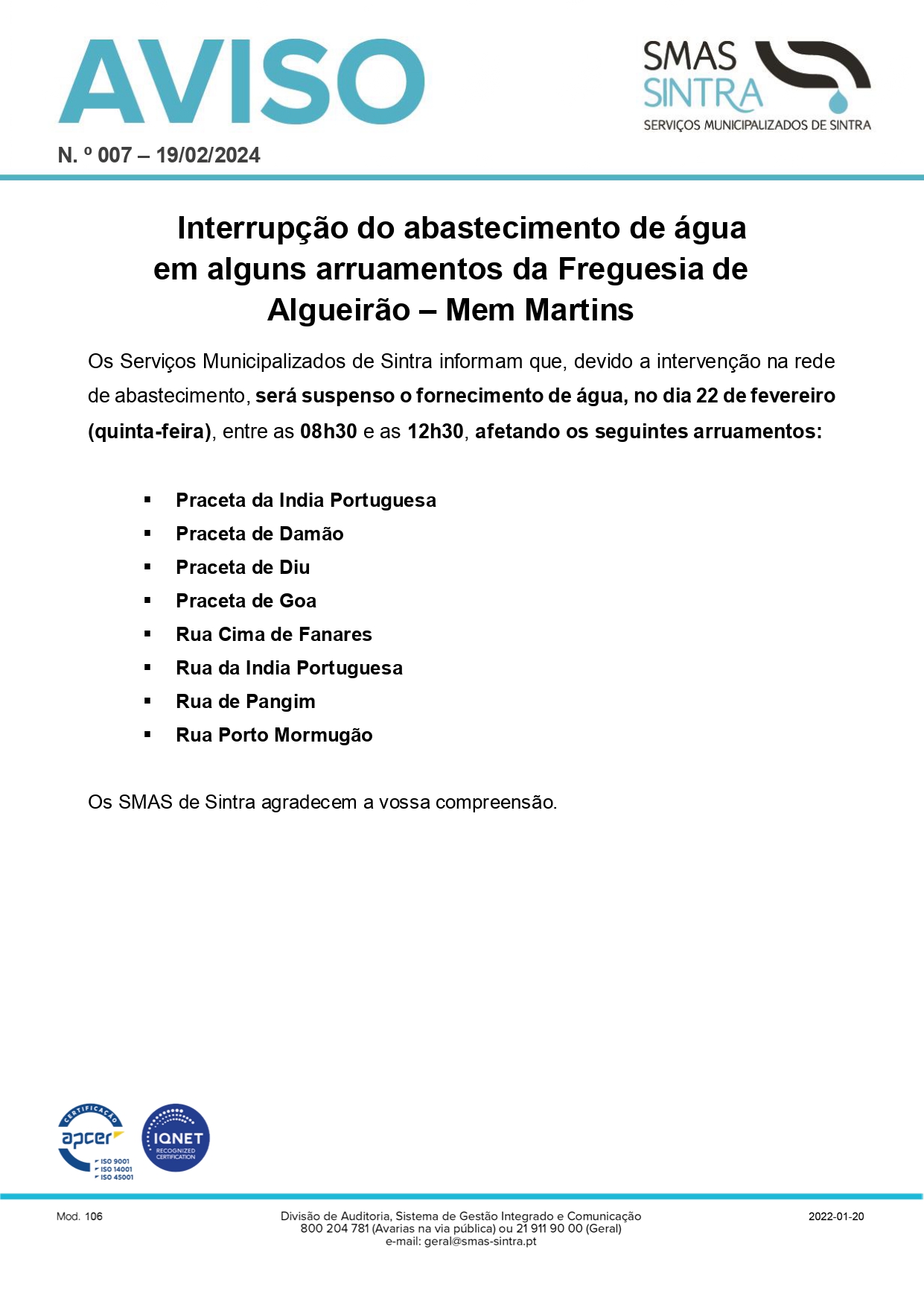 Os Serviços Municipalizados de Sintra informam que, devido a intervenção na rede de abastecimento, será suspenso o fornecimento de água, no dia 22 de fevereiro (quinta-feira), entre as 08h30 e as 12h30, afetando os seguintes arruamentos: