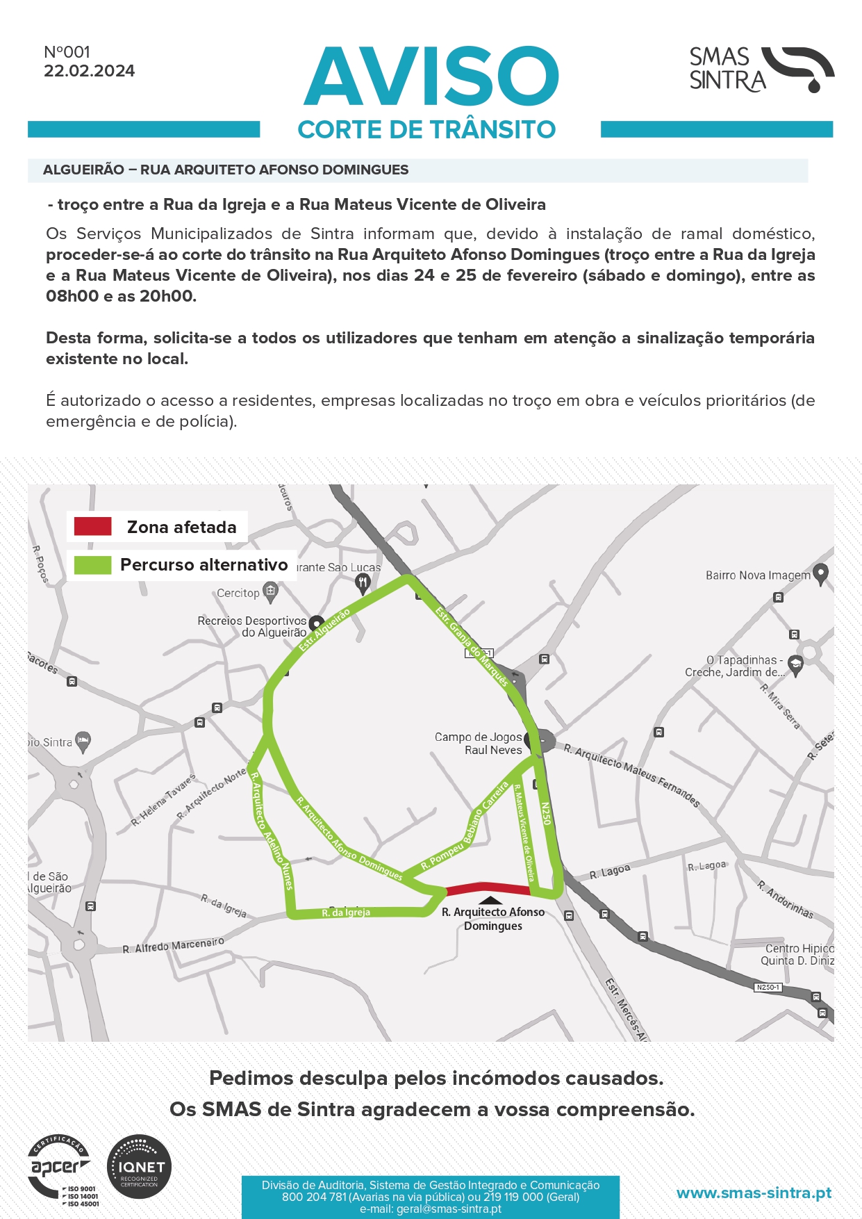 Os Serviços Municipalizados de Sintra informam que, devido à instalação de ramal doméstico, proceder-se-á ao corte do trânsito na Rua Arquiteto Afonso Domingues, Algueirão (troço entre a Rua da Igreja e a Rua Mateus Vicente de Oliveira), nos dias 24 e 25 de fevereiro (sábado e domingo), entre as 08h00 e as 20h00.