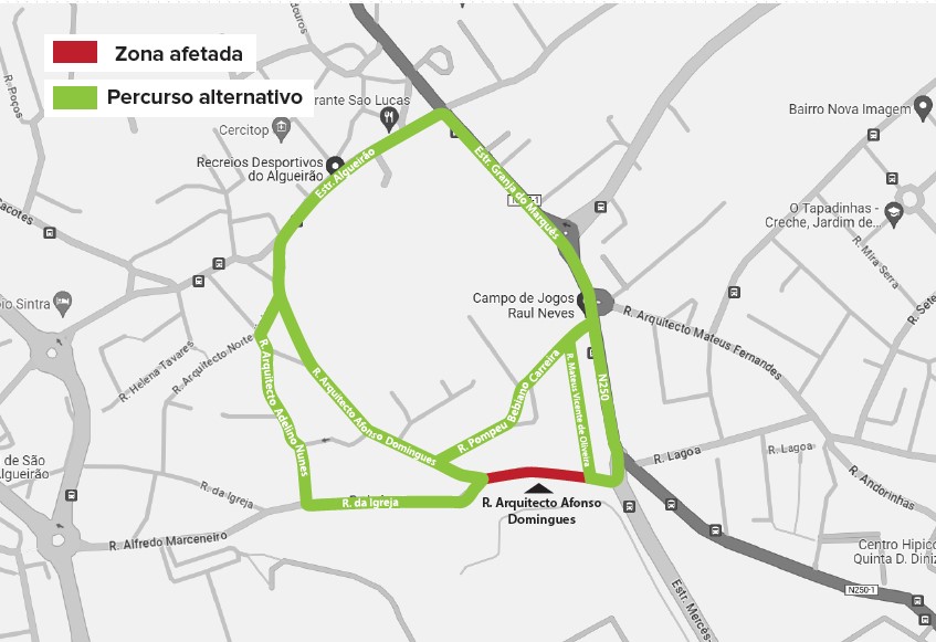 Os Serviços Municipalizados de Sintra informam que, devido à instalação de ramal doméstico, proceder-se-á ao corte do trânsito na Rua Arquiteto Afonso Domingues (troço entre a Rua da Igreja e a Rua Mateus Vicente de Oliveira), nos dias 16 e 17 de março (sábado e domingo), entre as 08h00 e as 20h00.
